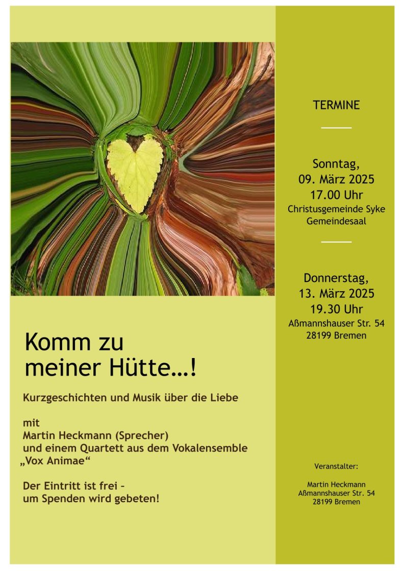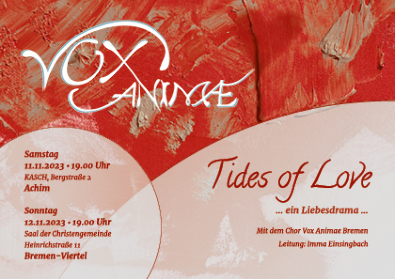 Neu im Repertoire des Chores ist die Mitwirkung eines Quartetts aus Vox Animae bei musikalischen Lesungen. Hier liest der Bremer Sprecher Martin Heckmann Liebesgeschichten und vier "Voxis" umrahmen das mit tollem Ensemblegesang. Aus dieser Reihe fanden bisher 3 Veranstaltungen statt, weitere sind geplant und können gebucht werden.