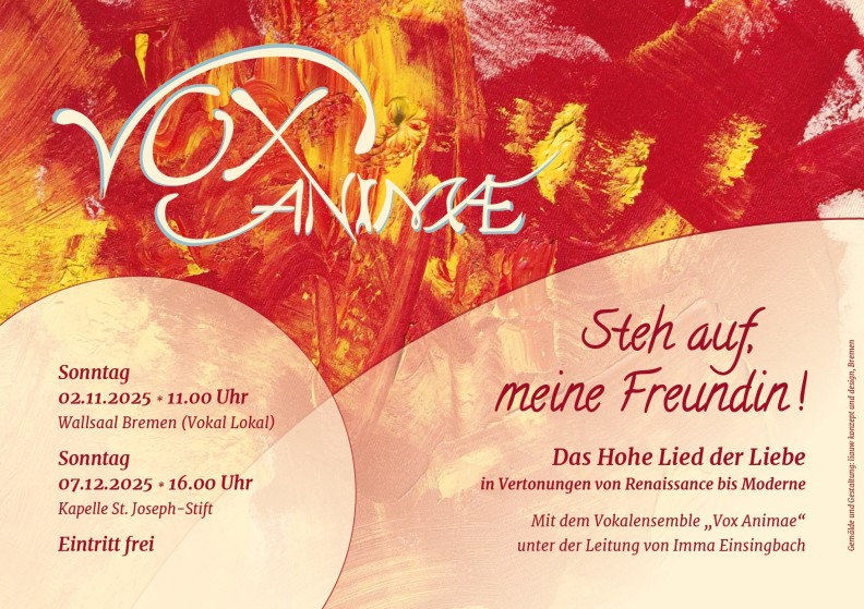 Im Herbst 2025 haben wir unser wunderbares Programm mit Hohelied-Vertonungen wieder aufgenommen - selbstverständlich im Stilmix alt/modern. Dabei schöpfen wir aus dem Repertoire von "Du bist schön, meine Freundin" (s.u.) und erarbeiten neue Stücke.