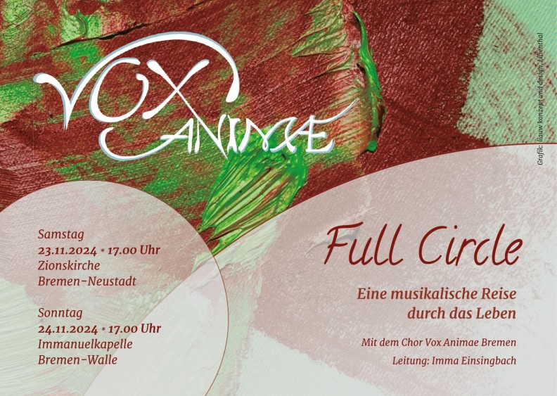 Wir singen weltliche und geistliche Werke, traditionelle und moderne Kompositionen, Evergreens und überraschende Entdeckungen. Mit Chor-und Ensemblemusik, die Generationen verbindet und stilistische Grenzen überschreitet vereint "Full Circle" sie zu einem musikalischen Lebenszyklus.